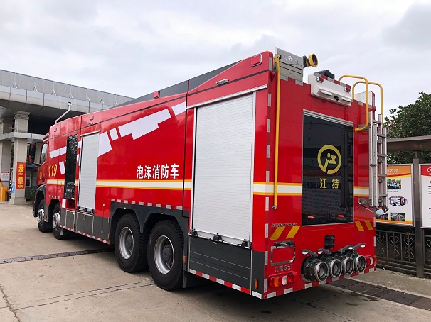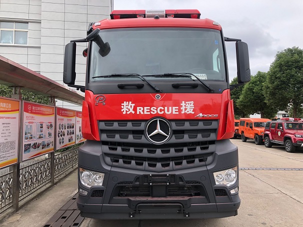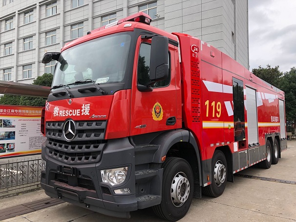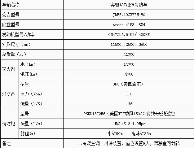 JDF5410GXFPM180型泡沫消防車、采用奔馳Arocs 4158 8X4底盤改裝而成。整車由消防員乘員室和車身兩大部分組成,乘員室為原裝單排駕駛室,可乘坐2人。該車為外露罐結構,車身前部為器材箱,中部為水罐,后部為泵房。載液罐體為優質碳鋼,內部噴涂環氧底漆及環氧瀝青漆,與底盤采用彈性連接,載水14000kg,泡沫液量4000kg,裝備了美國希爾8FC型消防泵,額定流量166L/S,車頂安裝美國TFT季風150S PSKD137256型車用消防炮。該車最大的特點是機動靈活、操控性好、維修簡便。可廣泛應用于公安消防隊、廠礦企業及社區、碼頭等場所,撲救大型油類火災和一般物質火災。
