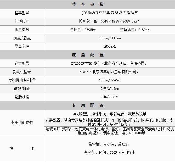江特牌JDF5030XZHB6型森林防火指揮車采用北京汽車制造廠有限公司牌BJ2030F7VMH型輕型越野汽車改裝而成,是一款適用于森林防火指揮的四驅越野森林防火指揮車,該車越野性能強悍,通過性好,核載5人,廣泛應用在道路崎嶇的山區和崎嶇不平的森林等,是野外森林消防指揮首選。
