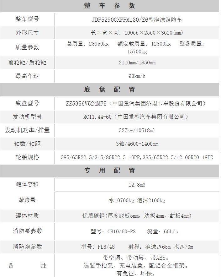 江特牌JDF5290GXFPM130/Z6型泡沫消防車采用重汽豪沃ZZ5356V524MF5底盤改裝而成。整車由消防員乘員室和車身兩大部分組成,乘員室為原裝雙排,可乘坐2+4人,該車為外露罐結(jié)構(gòu),車身前部為器材箱,中部為罐體,后部為泵房。載液罐體為優(yōu)質(zhì)碳鋼,內(nèi)部噴涂環(huán)氧底漆及環(huán)氧瀝青漆,與底盤采用彈性連接,載水量10700kg,泡沫液量2100kg,裝備了上海茸申消防器材有限公司生產(chǎn)CB10/60-RS型中低壓消防泵,額定流量60L/S,車頂安裝成都威斯特消防機(jī)械有限公司生產(chǎn)的PL8/48型車用消防炮。該車最大的特點(diǎn)是載液量大、操控性好、維修簡(jiǎn)便?蓮V泛應(yīng)用于公安消防隊(duì)、廠礦企業(yè)及社區(qū)、碼頭等場(chǎng)所,撲救大型油類火災(zāi)和一般物質(zhì)火災(zāi)。