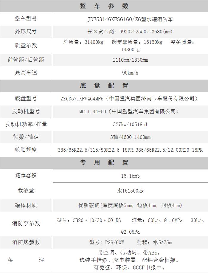 江特牌JDF5314GXFSG160/Z6型水罐消防車采用重汽豪沃ZZ5357TXFV464MF5底盤改裝而成。整車由消防員乘員室和車身兩大部分組成,乘員室為原裝雙排,可乘坐2+4人,該車為外露罐結構,車身前部為器材箱,中部為罐體,后部為泵房。載液罐體為優質碳鋼,內部噴涂環氧底漆及環氧瀝青漆,與底盤采用彈性連接,載水量161500kg,裝備了上海茸申消防設備有限公司生產CB20·10/30·60-RS型中低壓消防泵,額定流量60L/S,車頂安裝成都威斯特消防機械有限公司生產的PS8/60W型車用消防炮。該車最大的特點是載液量大、操控性好、維修簡便?蓮V泛應用于公安消防隊、廠礦企業及社區、碼頭等場所,撲救大型油類火災和一般物質火災。
