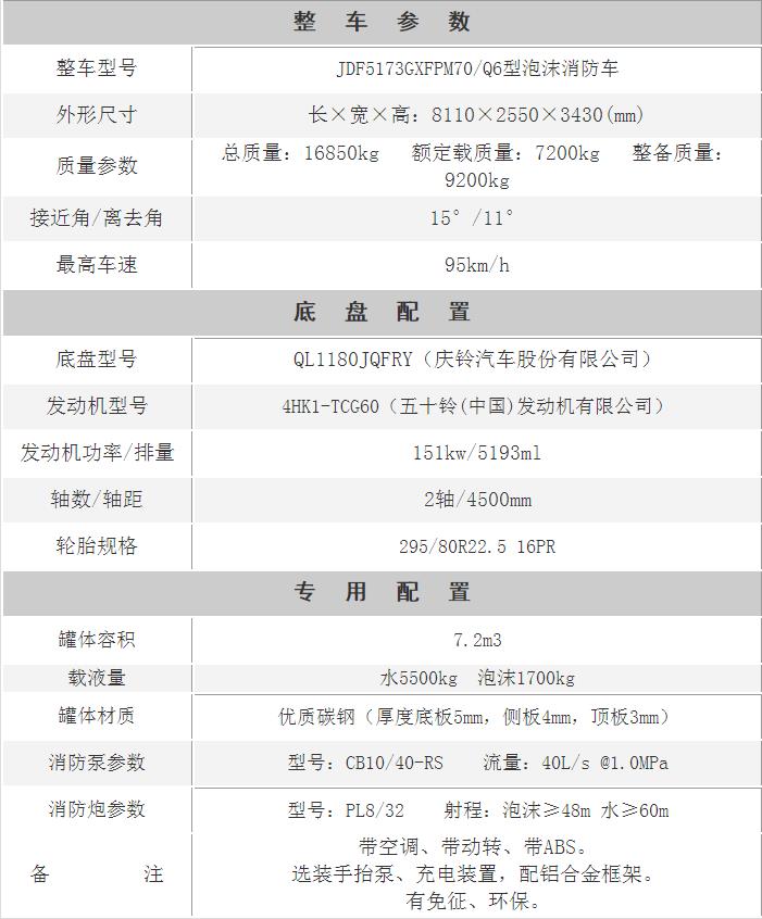 江特牌JDF5173GXFPM70/Q6型泡沫消防車采用慶鈴QL1180JQFRY底盤改裝而成。整車由消防員乘員室和車身兩大部分組成,乘員室為單排改雙排,可乘坐3+3人,該車為外露罐結構,車身前部為器材箱,中部為罐體,后部為泵房。載液罐體為優質碳鋼,內部噴涂環氧底漆及環氧瀝青漆,與底盤采用彈性連接,載水量5500kg,泡沫液量1700kg,裝備了上海茸申消防設備有限公司生產CB10/40-RS型常壓消防泵,額定流量40L/S,車頂安裝成都威斯特消防機械有限公司生產的PL8/32型車用消防炮。該車最大的特點是載液量大、操控性好、維修簡便。可廣泛應用于公安消防隊、廠礦企業及社區、碼頭等場所,撲救大型油類火災和一般物質火災。