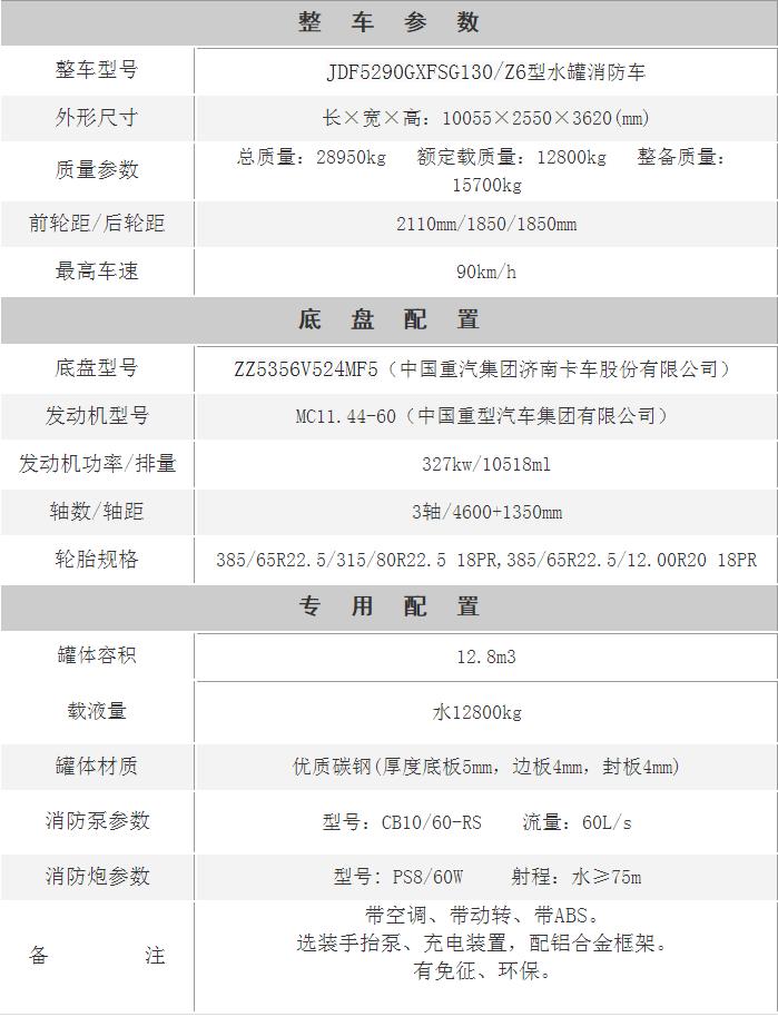 江特牌JDF5290GXFSG130/Z6型水罐消防車采用重汽豪沃ZZ5356V524MF5底盤改裝而成。整車由消防員乘員室和車身兩大部分組成,乘員室為原裝雙排,可乘坐2+4人,該車為外露罐結(jié)構(gòu),車身前部為器材箱,中部為罐體,后部為泵房。載液罐體為優(yōu)質(zhì)碳鋼,內(nèi)部噴涂環(huán)氧底漆及環(huán)氧瀝青漆,與底盤采用彈性連接,載水量12800kg,裝備了上海茸申消防器材有限公司生產(chǎn)CB10/60-RS型中低壓消防泵,額定流量60L/S,車頂安裝成都威斯特消防機械有限公司生產(chǎn)的PS8/60W型車用消防炮。該車最大的特點是載液量大、操控性好、維修簡便。可廣泛應(yīng)用于公安消防隊、廠礦企業(yè)及社區(qū)、碼頭等場所,撲救大型油類火災(zāi)和一般物質(zhì)火災(zāi)。