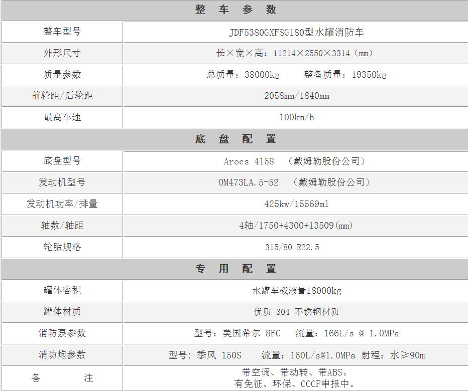 江特牌 JDF5380GXFSG180 型水罐消防車, 整車主要由梅賽德斯-奔馳 Arocs 4158 型消防車專用底盤、 獨立乘員室、 水罐、 泵室、 泵送系統、 智 能集成控制系統、 水槍、 水炮、 隨車消防器材以及其他附屬設施等組成。 整車改裝后載荷分配均勻, 質心位置和穩定性計算精確, 內部空間布局合 理, 能充分滿足操作人員的使用要求。