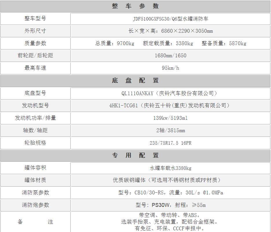 江特牌JDF5100GXFSG30/Q6型水罐消防車采用慶鈴QL1110ANKAY底盤改裝而成。整車由消防員乘員室和車身兩大部分組成,乘員室為雙排,可乘坐3+3人,該車為內藏罐結構,車身前部為器材箱,中部為水罐,后部為泵房。載液罐體為優質碳鋼,與底盤采用彈性連接,載水3380kg,裝備了上海茸申消防設備有限公司生產CB10/30-RS型低壓消防泵,額定流量30L/S,車頂安裝成都威斯特消防機械有限公司生產的PS30W型車用消防炮。該車最大的特點是載液量大、操控性好、維修簡便。可廣泛應用于公安消防隊、廠礦企業及社區、碼頭等場所,撲救大型油類火災或一般物質火災。