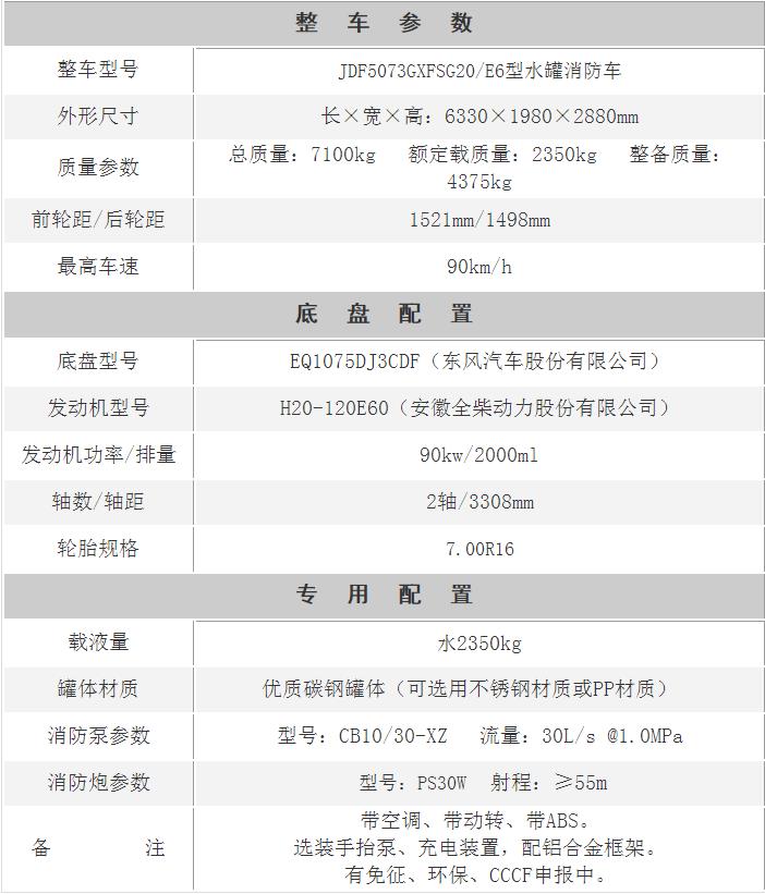 江特牌JDF5073GXFSG20/E6型水罐消防車,采用東風EQ1075DJ3CDF底盤改裝而成。整車由消防員乘員室和車身兩大部分組成,乘員室為原裝雙排,可乘坐2+3人,該車為內藏罐結構,車身兩側為器材箱,中部為水罐,后部為泵房。載液罐體為優質碳鋼,與底盤采用彈性連接,載水2350kg,裝備了上海雄真消防設備有限公司生產CB10/30型低壓消防泵,額定流量30L/S,車頂安裝成都威斯特消防機械有限公司生產的PS30W型車用消防炮。該車輛結構緊湊,配置完備,機動性強,能夠及時應對企業,社區或重點消防單位的火情,可以第一時間形成小型戰斗力進行初期火災的撲救和人員疏散撤離。可廣泛應用于消防救援站,政府專職消防隊,企業專職消防隊等。