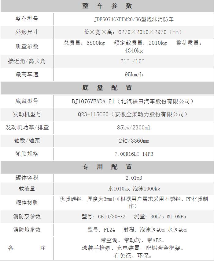 江特牌JDF5074GXFPM20/B6型泡沫消防車,采用北汽福田BJ1076VEADA-51底盤改裝而成。整車由消防員乘員室和車身兩大部分組成,乘員室為原裝雙排,可乘坐3+3人,該車為內倉罐結構,車身前部為水罐+器材箱,后部為泵房。載液罐體為優質碳鋼,與底盤采用彈性連接,載水量1010kg,泡沫液量1000kg,裝備了上海雄真消防設備有限公司生產CB10/30-XZ型消防泵,額定流量30L/S,車頂安裝成都威斯特消防機械有限公司生產的PL24型車用消防炮。該車最大的特點是機動靈活、操控性好、維修簡便。可廣泛應用于公安消防隊、廠礦企業及社區、碼頭等場所,撲救一般物質火災。