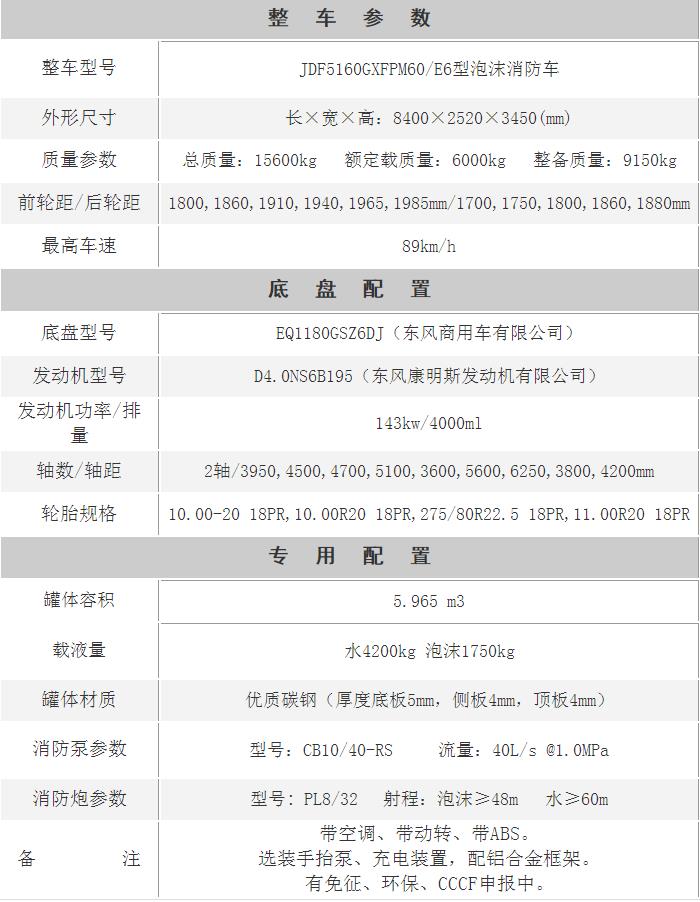 江特牌JDF5160GXFPM60/E6泡沫消防車(chē)采用東風(fēng)EQ1180GSZ6DJ底盤(pán)改裝而成。整車(chē)由消防員乘員室和車(chē)身兩大部分組成,乘員室為單排改雙排,可乘坐3+3人,該車(chē)為內(nèi)藏罐結(jié)構(gòu),車(chē)身兩側(cè)為器材箱,中部為罐體,后部為泵房。載液罐體為優(yōu)質(zhì)碳鋼,內(nèi)部噴涂環(huán)氧底漆及環(huán)氧瀝青漆,與底盤(pán)采用彈性連接,載水量4200kg,泡沫液量1750kg,裝備了上海茸申消防設(shè)備有限公司生產(chǎn)CB10/40-RS型常壓消防泵,額定流量40L/S,車(chē)頂安裝成都威斯特消防機(jī)械有限公司生產(chǎn)的PL8/32型車(chē)用消防炮。該車(chē)最大的特點(diǎn)是載液量大、操控性好、維修簡(jiǎn)便。可廣泛應(yīng)用于公安消防隊(duì)、廠礦企業(yè)及社區(qū)、碼頭等場(chǎng)所,撲救大型油類(lèi)火災(zāi)和一般物質(zhì)火災(zāi)。