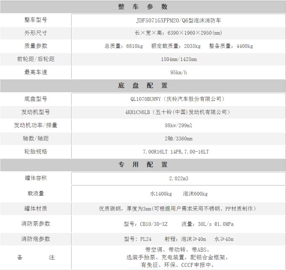 江特牌JDF5071GXFPM20/Q6型泡沫消防車,采用慶鈴QL1070BUHWY底盤改裝而成。整車由消防員乘員室和車身兩大部分組成,乘員室為原裝雙排,可乘坐2+3人,該車為內藏罐結構,車身兩側為器材箱,中部為水罐,后部為泵房。載液罐體為優質碳鋼,與底盤采用彈性連接,載水1400kg,泡沫液量600kg,裝備了上海雄真消防設備有限公司生產CB10/30-XZ型低壓消防泵,額定流量30L/S,車頂安裝成都威斯特消防機械有限公司生產的PL24型車用消防炮。該車輛結構緊湊,配置完備,機動性強,能夠及時應對企業,社區或重點消防單位的火情,可以第一時間形成小型戰斗力進行初期火災的撲救和人員疏散撤離。可廣泛應用于消防救援站,政府專職消防隊,企業專職消防隊等。