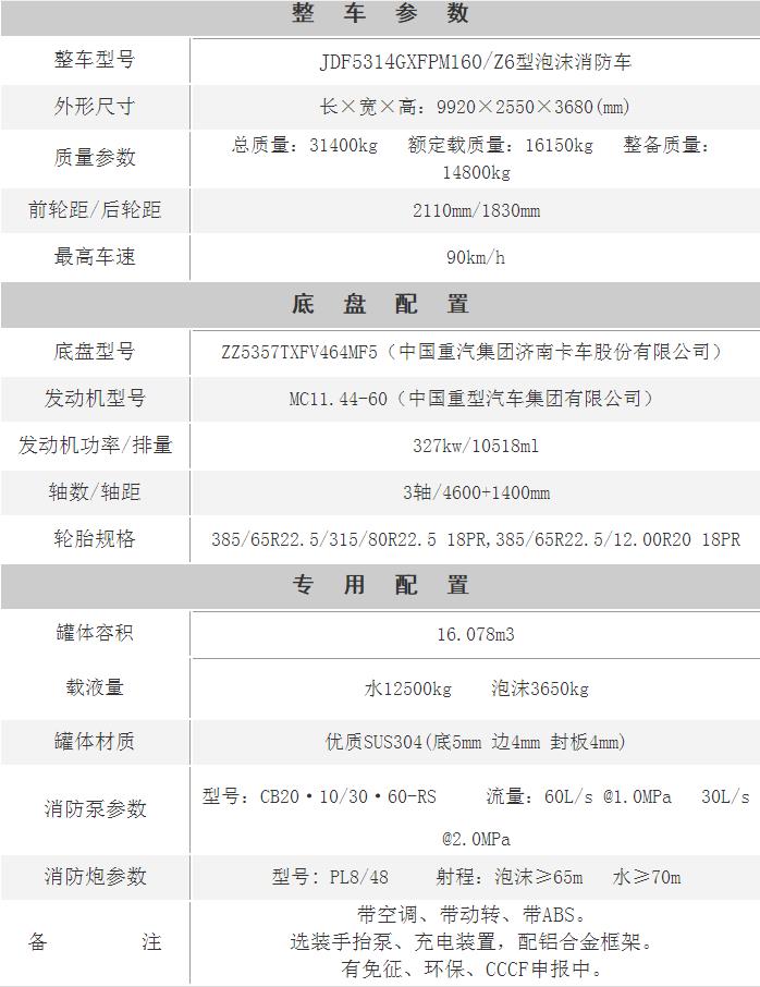 江特牌JDF5314GXFPM160/Z6型泡沫消防車采用重汽豪沃ZZ5357TXFV464MF5底盤改裝而成。整車由消防員乘員室和車身兩大部分組成,乘員室為原裝雙排,可乘坐2+4人,該車為外露罐結構,車身前部為器材箱,中部為罐體,后部為泵房。載液罐體為優質碳鋼,內部噴涂環氧底漆及環氧瀝青漆,與底盤采用彈性連接,載水量12500kg,泡沫液量3650kg,裝備了上海茸申消防設備有限公司生產CB20·10/30·60-RS型中低壓消防泵,額定流量60L/S,車頂安裝成都威斯特消防機械有限公司生產的PL8/48型車用消防炮。該車最大的特點是載液量大、操控性好、維修簡便。可廣泛應用于公安消防隊、廠礦企業及社區、碼頭等場所,撲救大型油類火災和一般物質火災。