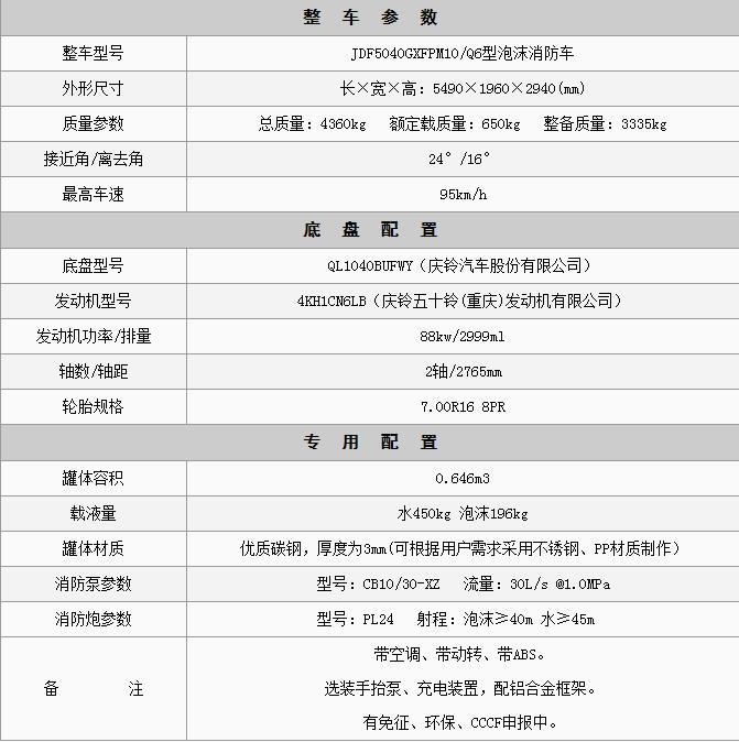 江特牌JDF5040GXFPM10/Q6型泡沫消防車采用慶鈴QL1040BUFWY底盤改裝而成。整車由消防員乘員室和車身兩大部分組成,乘員室為原裝雙排,可乘坐2+3人,該車為內倉罐結構,車身前部為水罐+器材箱,后部為泵房。載液罐體為優質碳鋼,與底盤采用彈性連接,載水量450kg,泡沫液量196kg,裝備了上海雄真消防設備有限公司生產CB10/30-XZ型消防泵,額定流量30L/S,車頂安裝成都威斯特消防機械有限公司生產的PL24型車用消防炮。該車最大的特點是機動靈活、操控性好、維修簡便。可廣泛應用于公安消防隊、廠礦企業及社區、碼頭等場所,撲救一般物質火災。