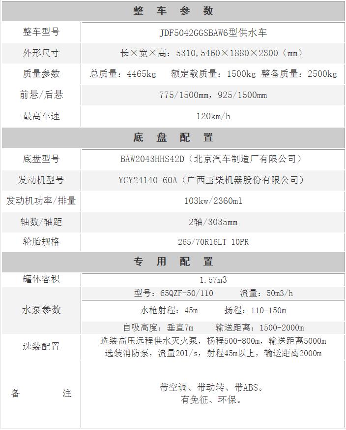 江特牌JDF5042GGSBAW6型供水車采用北京汽車制造廠有限公司生產的BAW2043HHS42D型輕型二類越野底盤改裝而成,該車最大的特點就是機動靈活、速度快、操控性好、駕駛舒適,越野性能強,可廣泛應用于在丘陵、山地、凹地、河谷、森林等地帶巡邏,及時發現火情,撲滅小型火災。
