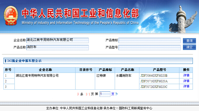 據(jù)中華人民共和國工業(yè)和信息化部批示,湖北江南專用特種汽車有限公司申報的消防車國四公告在262批公示,此次下批國四消防車車型是2-3噸小型消防車,即將下來的國四消防車公告車型是JDF5064GXFSG20B型水罐消防車,JDF5071GXFSG20A型水罐消防車和JDF5072GXFSG20C 型水罐消防車。湖北江南其他消防車將陸續(xù)下批,敬請各購車用戶關注。