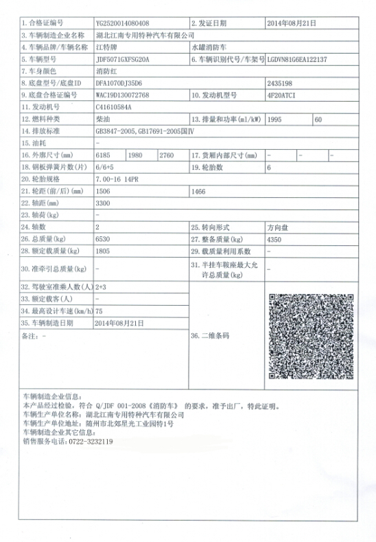 由湖北江南專用特種汽車有限公司生產的東風銳鈴國四消防車公告以予8月份下批,廣大購買消防車的客戶可放心購買,該款車可以落戶。