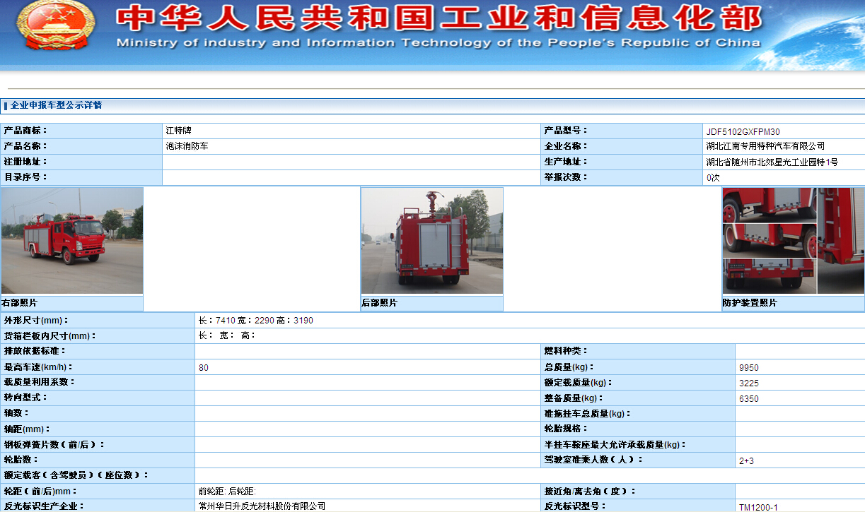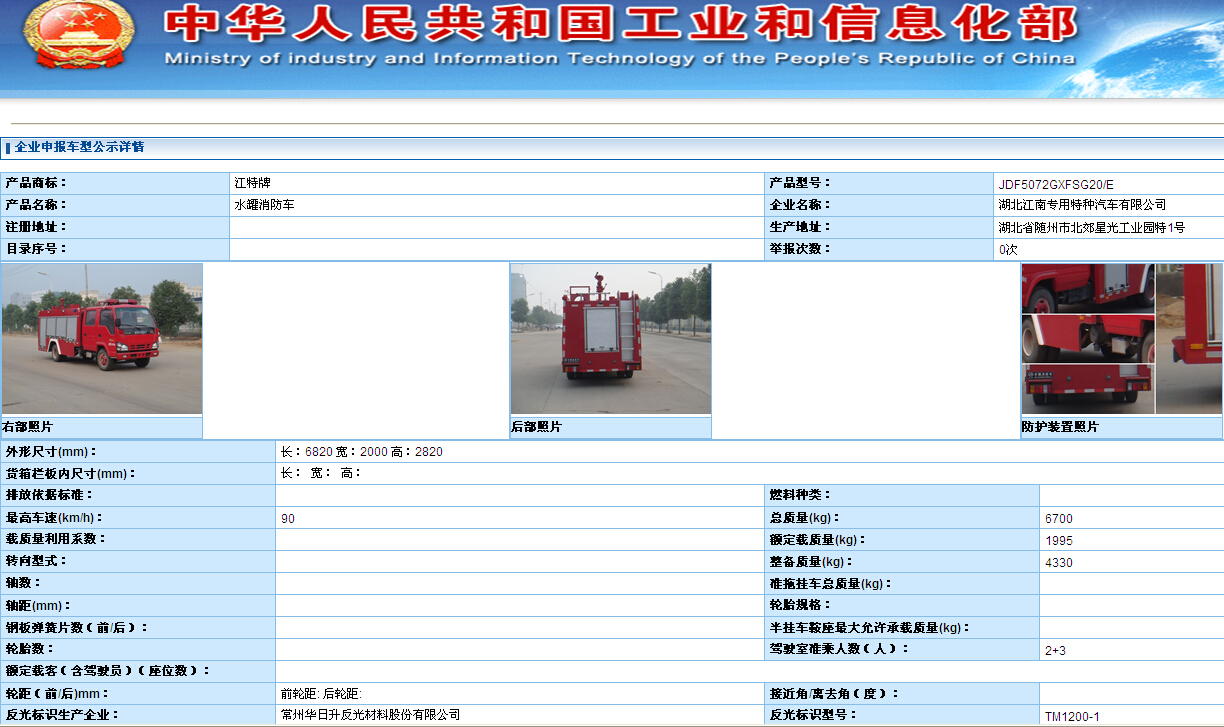 湖北江南專用特種汽車有限公司申報給工信部慶鈴4噸水罐消防車和慶鈴5噸泡沫消防車已經公示于工業和信息化部,不久公告將下發: