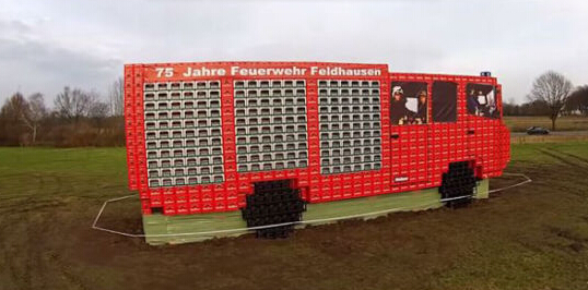 小鎮的消防員們將打造這輛啤酒罐消防車的過程錄制了下來,并傳到了視頻分享網站YouTube上。從視頻中可以看到,消防員們靠人力完成啤酒罐的排列,并最后通過起重機完成了這輛長11.5米、高5米的消防車的搭建工作。