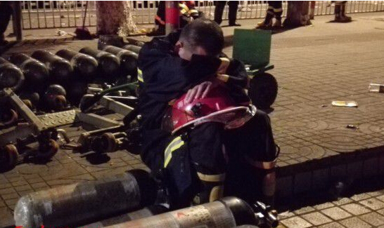 小編趕到事發現場,只見幾十名消防兵依在消防車旁邊睡著了,有的甚至坐在柱子上都已經瞇著了,附近居民見到這些情景,不禁豎著大拇指“消防兵是最可愛的人”。