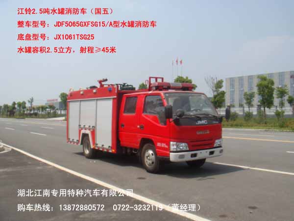 江鈴2.5噸水罐消防車(國五)采用3.36米軸距JX1061TSG25型江鈴新順達底盤,國五排放標準,江鈴汽車公司JX493ZLQ5A柴油發動機115馬力,帶動轉、原廠空調和ABS,水罐容積2.5-3立方,采用CB10/20型消防泵,PS20W型消防炮,射程≥45米。江鈴消防車具有輕快省油、噪音小、動力強勁、扎實耐用、機動性強、噴灑射程遠等優勢和特點,2.5噸江鈴消防車可從天然水源和消防栓直接吸水,向其他消防車輛和消防裝備供水,也可用于缺水地區輸水供水,適合撲滅一般性火災,是廠礦企業、石油化工、森林港口消防隊、企事業單位及消防官兵滅火戰斗、搶險救援的最佳消防車輛。歡迎致電:0722-3232119 13872880572,了解更多國四江鈴消防車價格、2.5噸江鈴消防車圖片、江鈴3噸消防車配置和參數。