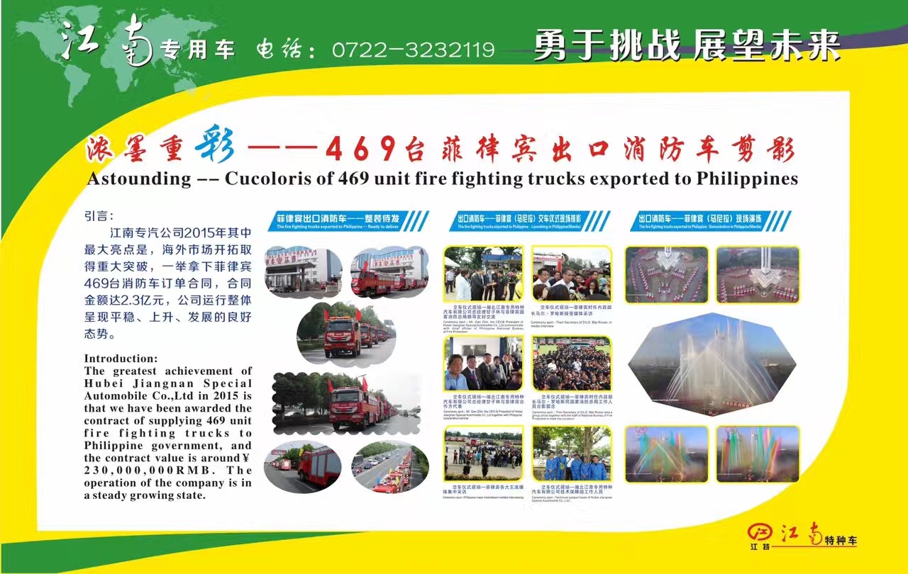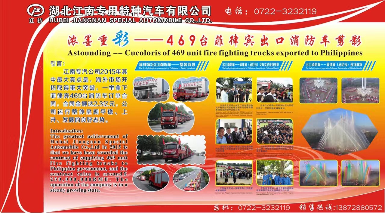 江南公司以質量優先,穩中求發展,在2015-2016年期間海外市場開拓取得重大突破,一舉重下菲律賓469臺消防車大訂單,合同金額達2.3億元,公司運行整體呈現平穩、上升、積極發展的良好勢態,這一事實證明,江南消防車的實力,江南消防車的質量不光贏得了國內市場,更贏來了國外大市場。湖北江南消防車廠總機熱線:0722-3232119