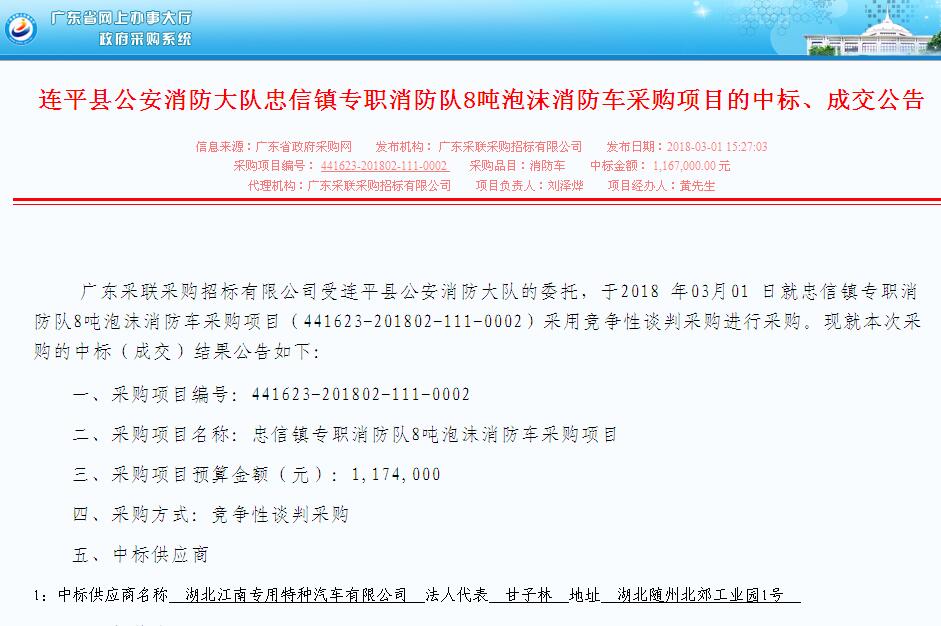 熱烈慶祝本公司湖北江南專用特種汽車有限公司喜中廣東省河源連平縣公安消防隊舉行的8噸泡沫消防車采購項目標,我公司在此次招標工作中,完全體現了本公司的實力,規模大、質量好、價格低、消防車資質齊全、檢測報告和3C認證均齊全,層層打敗了競爭對手,突顯了本公司消防車的優勢和實力。以下是中標公示結果。
