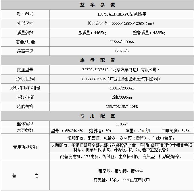 江特牌JDF5041XXHBAW6型救險車采用北京汽車制造廠有限公司牌BAW2043HMS61D型輕型越野汽車改裝而成,該車主要用于突發自然災害、突發安全事故或火災等應急搶險保障。車內設計有專用器材架,車頂設計有設備平臺,可根據實際使用需要配置各種應急救援裝備或專用工具、設備器具。廣泛適用于軍隊、公安特勤、醫療衛生部門的自然災害搶險、消防救援;以及石油、化工、天然氣、供水供電等管道的檢測與搶修;還可運用于高壓輸變電線路、高速公路、礦山等設備故障的搶修維護等多種用途。