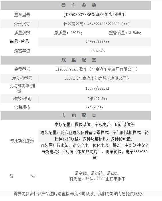 江特牌JDF5030XZHB6型森林防火指揮車采用北京汽車制造廠有限公司牌BJ2030F7VMH型輕型越野汽車改裝而成,是一款適用于森林防火指揮的四驅越野森林防火指揮車,該車越野性能強悍,通過性好,核載5人,廣泛應用在道路崎嶇的山區和崎嶇不平的森林等,是野外森林消防指揮首選。