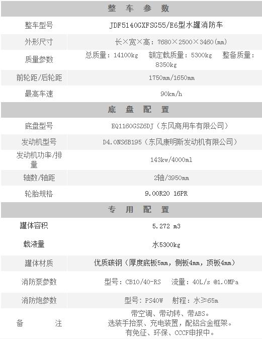 江特牌JDF5140GXFSG55/E6水罐消防車采用東風(fēng)EQ1160GSZ6DJ底盤改裝而成。整車由消防員乘員室和車身兩大部分組成,乘員室為單排改雙排,可乘坐3+3人,該車為內(nèi)藏罐結(jié)構(gòu),車身兩側(cè)為器材箱,中部為罐體,后部為泵房。載液罐體為優(yōu)質(zhì)碳鋼,內(nèi)部噴涂環(huán)氧底漆及環(huán)氧瀝青漆,與底盤采用彈性連接,載水5300kg,裝備了上海茸申消防設(shè)備有限公司生產(chǎn)CB10/40-RS型常壓消防泵,額定流量40L/S,車頂安裝成都威斯特消防機(jī)械有限公司生產(chǎn)的PS40W型車用消防炮。該車最大的特點是載液量大、操控性好、維修簡便。可廣泛應(yīng)用于公安消防隊、廠礦企業(yè)及社區(qū)、碼頭等場所,撲救大型油類火災(zāi)和一般物質(zhì)火災(zāi).