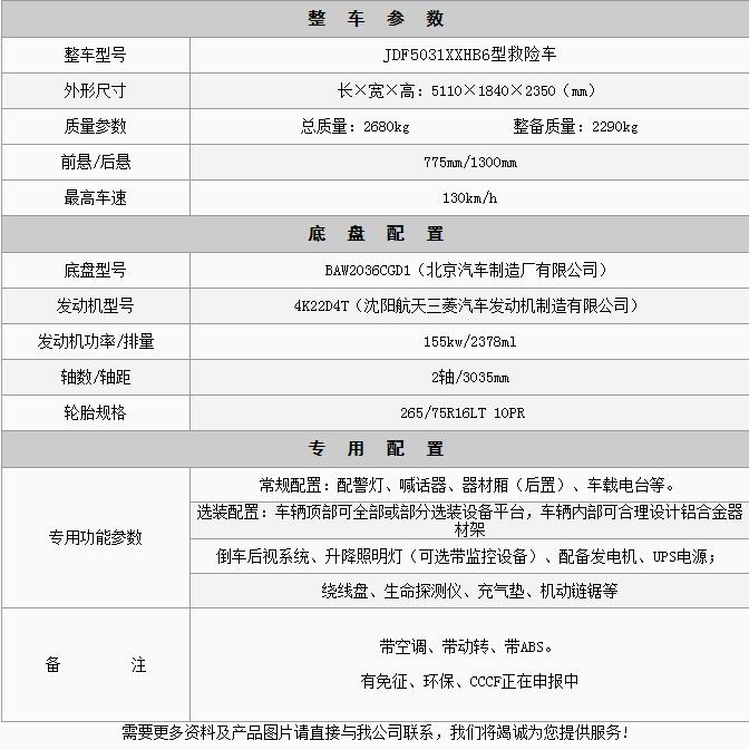 江特牌JDF5031XXHB6型救險車采用北京汽車制造廠有限公司牌BAW2036CGD1型輕型越野汽車改裝而成,該車主要用于突發自然災害、突發安全事故或火災等應急搶險保障。車內設計有專用器材架,車頂設計有設備平臺,可根據實際使用需要配置各種應急救援裝備或專用工具、設備器具。廣泛適用于軍隊、公安特勤、醫療衛生部門的自然災害搶險、消防救援;以及石油、化工、天然氣、供水供電等管道的檢測與搶修;還可運用于高壓輸變電線路、高速公路、礦山等設備故障的搶修維護等多種用途。