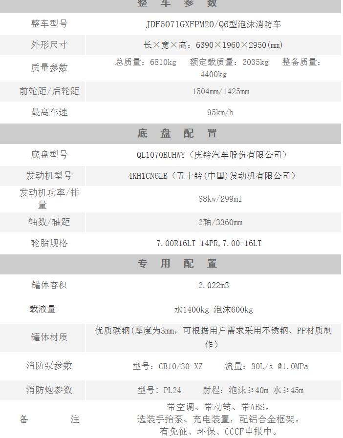江特牌JDF5071GXFPM20/Q6型泡沫消防車,采用慶鈴QL1070BUHWY底盤改裝而成。整車由消防員乘員室和車身兩大部分組成,乘員室為原裝雙排,可乘坐2+3人,該車為內藏罐結構,車身兩側為器材箱,中部為水罐,后部為泵房。載液罐體為優質碳鋼,與底盤采用彈性連接,載水1400kg,泡沫液量600kg,裝備了上海雄真消防設備有限公司生產CB10/30-XZ型低壓消防泵,額定流量30L/S,車頂安裝成都威斯特消防機械有限公司生產的PL24型車用消防炮。該車輛結構緊湊,配置完備,機動性強,能夠及時應對企業,社區或重點消防單位的火情,可以第一時間形成小型戰斗力進行初期火災的撲救和人員疏散撤離。可廣泛應用于消防救援站,政府專職消防隊,企業專職消防隊等。