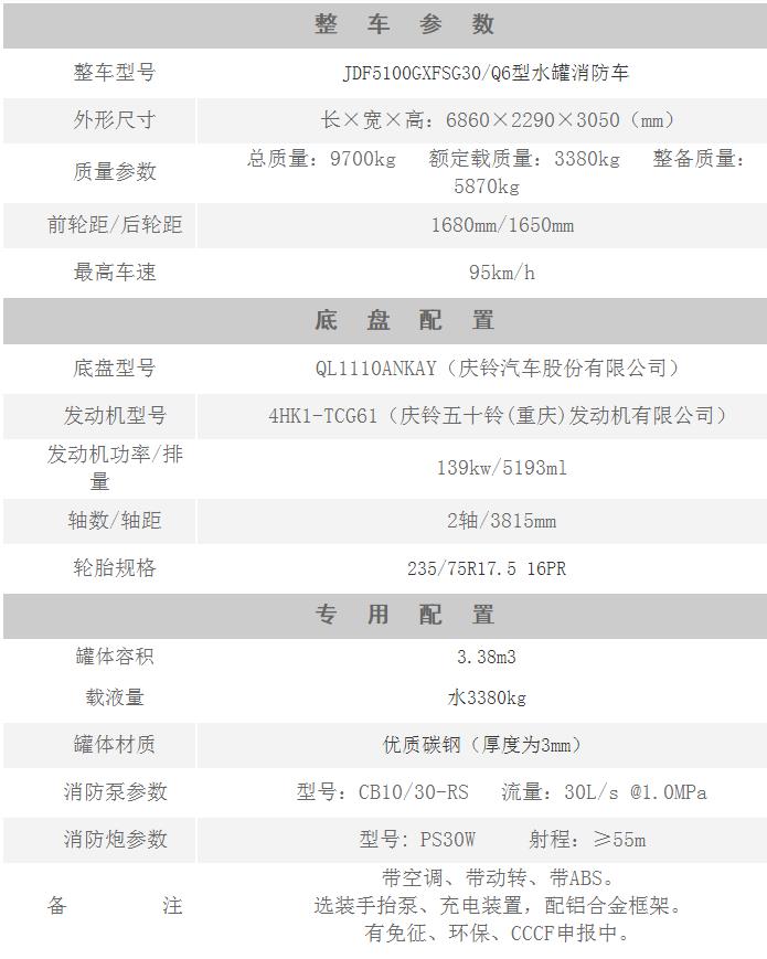 江特牌JDF5100GXFSG30/Q6型水罐消防車采用慶鈴QL1110ANKAY底盤改裝而成。整車由消防員乘員室和車身兩大部分組成,乘員室為雙排,可乘坐3+3人,該車為內藏罐結構,車身前部為器材箱,中部為水罐,后部為泵房。載液罐體為優質碳鋼,與底盤采用彈性連接,載水3380kg,裝備了上海茸申消防設備有限公司生產CB10/30-RS型低壓消防泵,額定流量30L/S,車頂安裝成都威斯特消防機械有限公司生產的PS30W型車用消防炮。該車最大的特點是載液量大、操控性好、維修簡便。可廣泛應用于公安消防隊、廠礦企業及社區、碼頭等場所,撲救大型油類火災或一般物質火災。