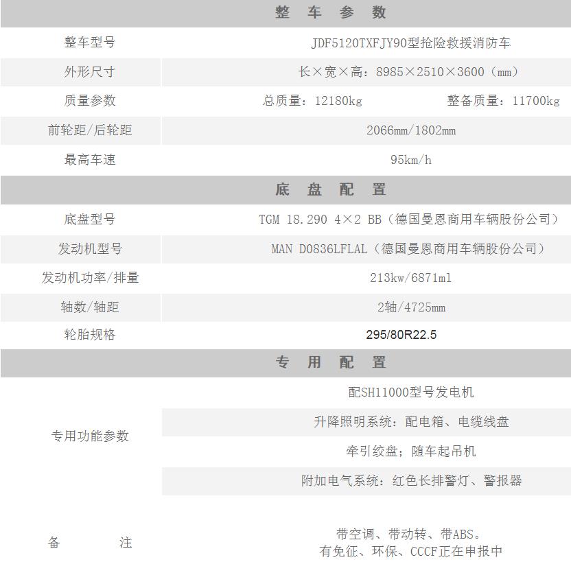 JDF5120TXFJY90搶險救援消防車是我公司應用新技術、新工藝,自主研制開發的具有自主知識產權的最新產品。該車系選用德國曼恩商用車輛股份公司生產的TGM18.290二類汽車底盤改裝而成,原裝雙排駕駛室,可載含駕駛員在內的乘員6人,駕乘舒適輕便。 在引進國外最先進的技術基礎上,結合國內外搶險特點進行創新開發設計,根據用戶需要可配備有偵檢類、警戒類、救生類、破拆類、照明類、個人防護類各種搶險救援器材。器材安裝在抽拉拖板、立式抽拉、旋轉拉架上。整車線型流暢、外觀新穎、美觀大方、器材布置合理緊湊、取拿方便,是消防部隊和企業進行搶險救援領域的好幫手。該車主要用于大中城市、人口稠密地方搶險救援工作。搶險救援消防車裝備到公安消防部隊,增強了部隊的戰斗力,為消防部隊的正規化、現代化建設作出積極的貢獻。