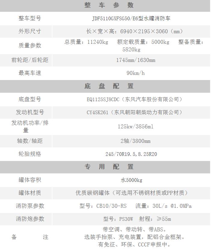 江特牌JDF5110GXFSG50/E6型水罐消防車采用東風EQ1125SJ8CDC底盤改裝而成。整車由消防員乘員室和車身兩大部分組成,乘員室為雙排,可乘坐3+3人,該車為外露罐結(jié)構(gòu),車身前部為器材箱,中部為水罐,后部為泵房。載液罐體為優(yōu)質(zhì)碳鋼,與底盤采用彈性連接,載水5000kg,裝備了上海茸申消防設備有限公司生產(chǎn)CB10/30-RS型低壓消防泵,額定流量30L/S,車頂安裝成都威斯特消防機械有限公司生產(chǎn)的PS30W型車用消防炮。該車輛結(jié)構(gòu)緊湊,配置完備,機動性強,能夠及時應對企業(yè),社區(qū)或重點消防單位的火情,可以第一時間形成小型戰(zhàn)斗力進行初期火災的撲救和人員疏散撤離。可廣泛應用于消防救援站,政府專職消防隊,企業(yè)專職消防隊等。