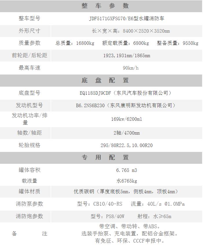 江特牌JDF5171GXFSG70/E6型水罐消防車采用東風EQ1185DJ9CDF底盤改裝而成。整車由消防員乘員室和車身兩大部分組成,乘員室為原裝雙排,可乘坐3+3人,該車為內藏罐結構,車身兩側為器材箱,中部為罐體,后部為泵房。載液罐體為優質碳鋼,內部噴涂環氧底漆及環氧瀝青漆,與底盤采用彈性連接,載水6765kg,裝備了上海茸申消防設備有限公司生產CB10/40-RS型常壓消防泵,額定流量40L/S,車頂安裝成都威斯特消防機械有限公司生產的PS8/40W型車用消防炮。該車最大的特點是載液量大、操控性好、維修簡便。可廣泛應用于公安消防隊、廠礦企業及社區、碼頭等場所,撲救大型油類火災和一般物質火災。