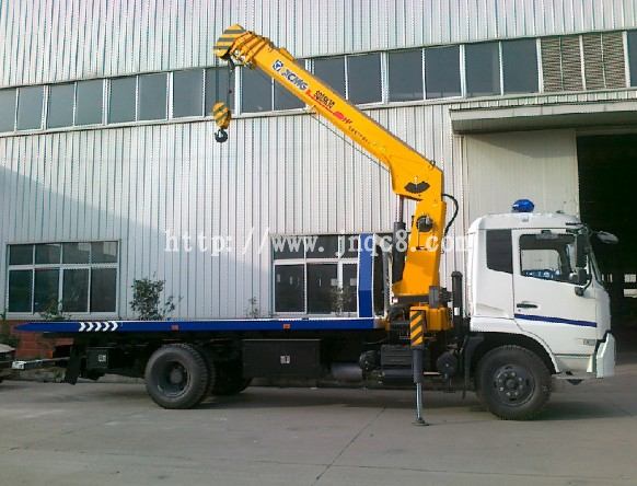 平板帶吊型清障車吊機可選用徐工5噸的,8噸的直臂或折臂,吊機可360度放置;平板長6米,寬2.5米,板子厚5mm,平板可自動下滑;后拖臂額定拖舉 4000kg。