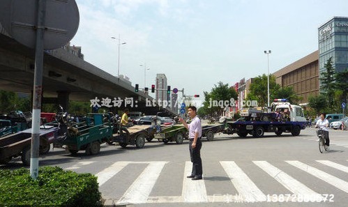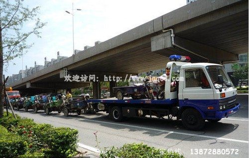3月13日,在隨州解放路街頭出現一輛由湖北江南專用特種汽車有限公司生產的江特牌清障車拖著20多輛機動車從鬧市中穿過,該車平板上背一輛三輪車及三輛摩托車,后拖臂上拖著二十多輛三輪車。這種平板型清障車方便適用,可上背一輛車下拖一輛車。 新款平板清障車在原基礎上板子加長加厚,采用一次性成形技術,使板子更結實耐用,花紋式防滑板使用起來更安全可靠;可以同時處理兩臺事故車輛,上背下拖,主要適用于3-4噸以內的車輛;平板清障車廣泛用于公路、公安交警、汽車修理、小車4S店及城市管理等有關部門。