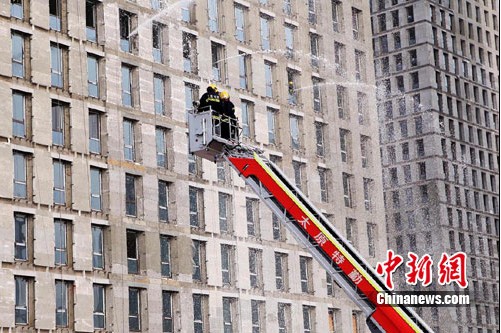 儀式現(xiàn)場,太原市消防支隊利用剛剛配發(fā)的特種消防車,在太原市萬國城MOMA高層建筑進(jìn)行了實地消防演練,檢驗了新式裝備對高層建筑滅火的高效能力。