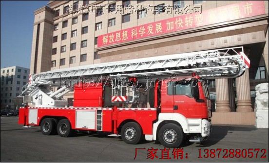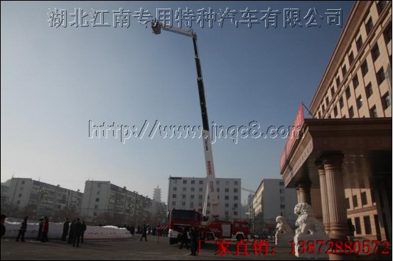 消防車|消防車廠家|登高消防車|江南消防車|江南專汽:這輛價值500多萬登高平臺消防車采用德國MAN原裝底盤,上裝具有云梯、曲臂、泡沫、起重的多項功能;吊籃承重400kg;有兩個水炮,可同時工作,自帶A類泡沫發生器,可載水2.5噸;吸水深度可達11m;車身長13.5米,高3.995m,寬2.75m,時速最快85km/h;臂伸起長度54米,收合12.9米。整車性能先進,動作平穩,微動性好,滅火能力強,操作安全可靠,并具有數字顯示等先進功能,廣泛用于城市、工礦企業等高層建筑以及石油化工企業、油罐、倉庫等高大建筑物的火災撲救。