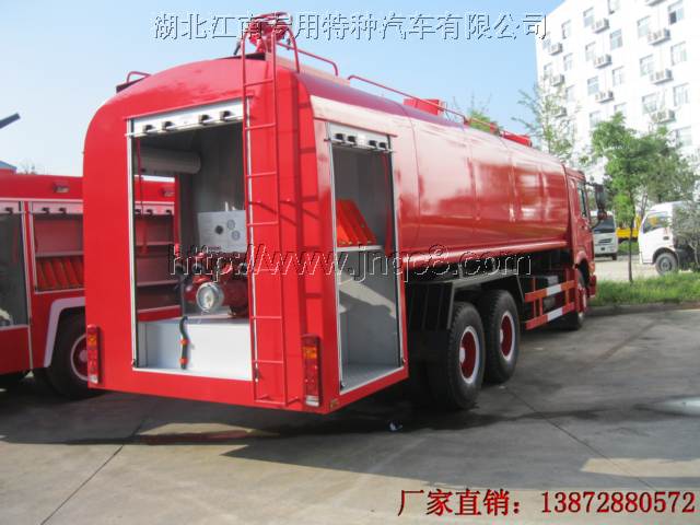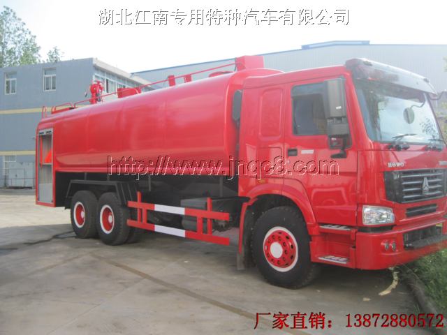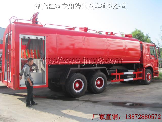 消防車|消防車廠家|消防車價格|消防車配件|消防車圖片|江南消防車湖北江南專汽消防車事業部生產一輛大噸位大功率消防車,此車是采用期太爾豪沃底盤改裝而成,罐體容積25噸,采用大功率消防泵和消防炮,射程達80米以上,此消防車可用作遠距離供水,更大用途就是消防功能。