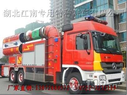 消防車|消防車廠家|消防車價格|森林消防車|江南消防車:正負壓排排煙消防車底盤采用原裝奔馳3354底盤,由消防車廠家改裝,帶罐、帶泵,水罐載量3噸。該輛消防車正負壓排煙消防車外形穩重、新穎、大方,尾部裝有6個桶裝排風口,分為兩排,價值341萬元。一旦全部開啟排風口,最大排風量800000立方每小時,細水霧噴射最遠距離大于80米,正壓連接排煙管時最遠送風距離不小于500米,負壓連接排煙管時最遠抽風距離大于300米,風暴排煙裝置可上下升降、360度旋轉。